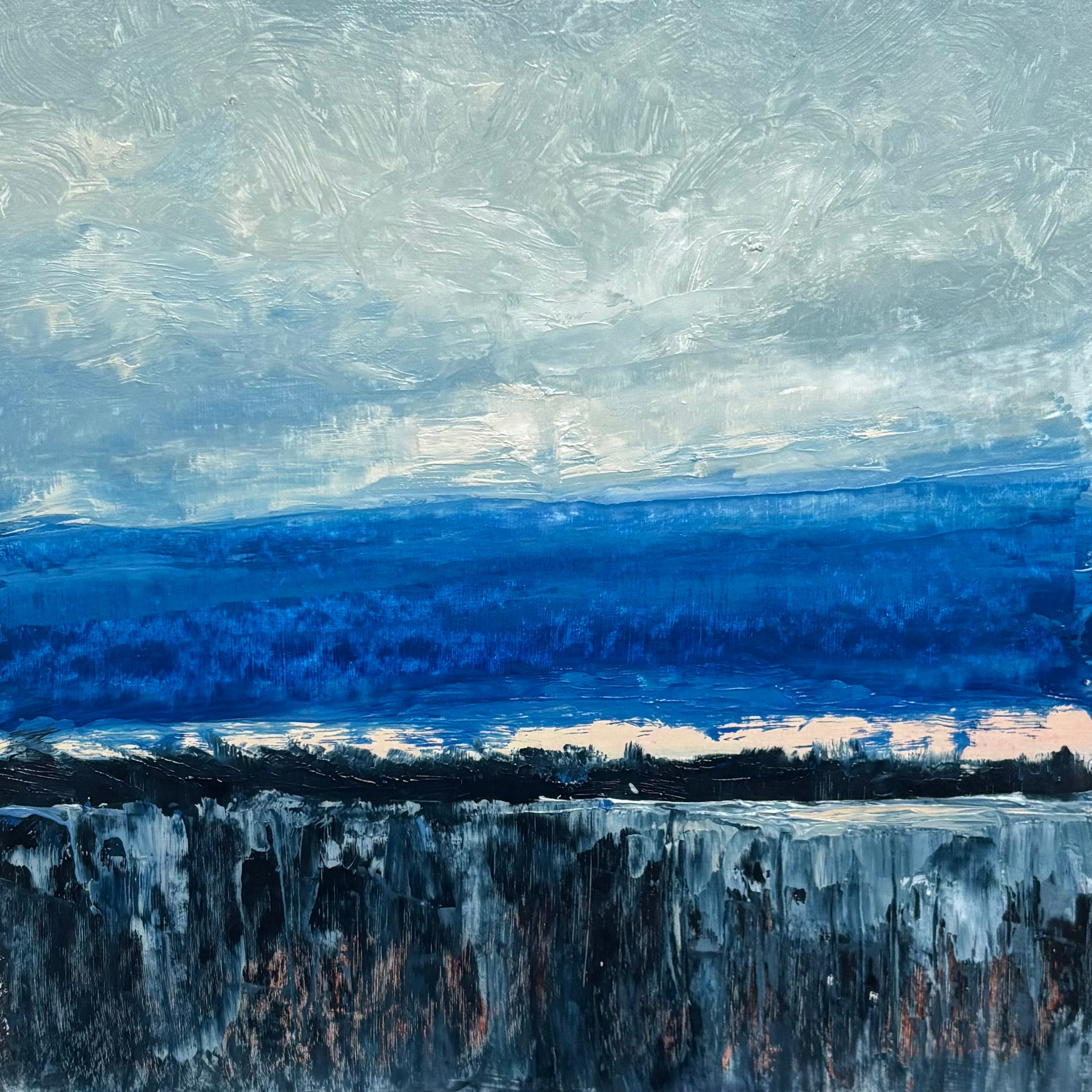 The paintings tend toward abstraction. There’s a lot of sky, a lot of tension. Some are immediately recognizable, while others less so. I paint from memory, often months after the fact, which means the work is about the atmosphere of the moment and the feeling I had rather than accuracy to the landscape.