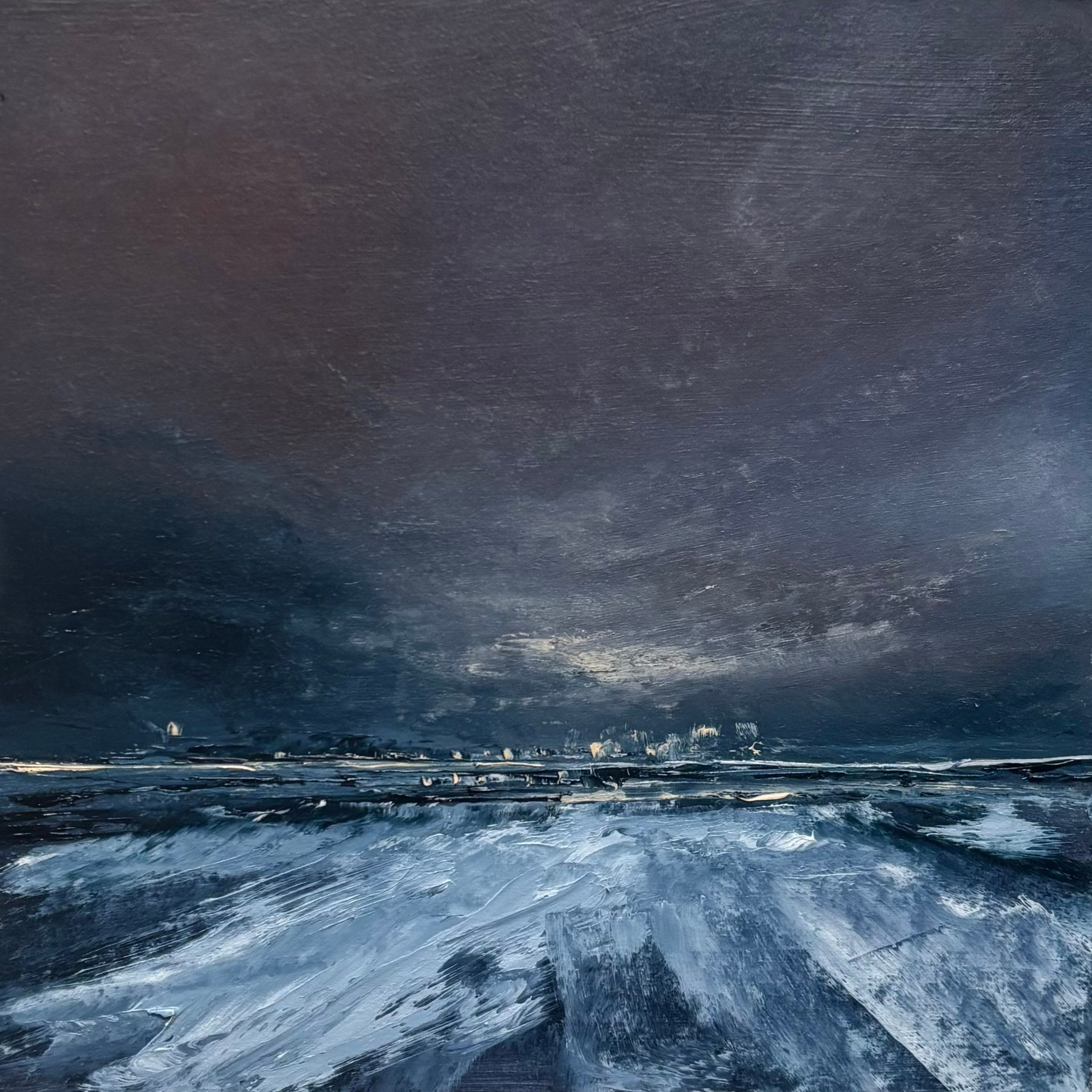 20×20cm, oil on cardboard, returning to places and memories that were once so present: the clouds of Venice, the sunset in Lyon, fragments of landscapes during the journeys in between.